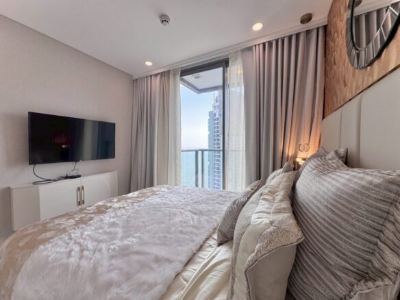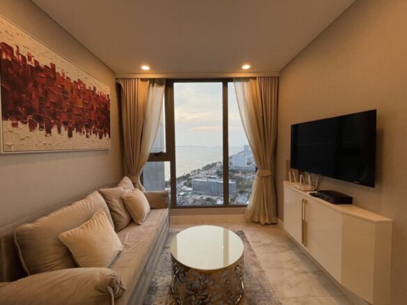 Experience premium beachfront living at Arom Wongamat, one of Pattaya’s most exclusive high-rise residences in the sought-after Wongamat area. This elegant unit offers 2 bedrooms, 2 bathrooms, and a spacious 86 sq.m. layout on the 25th floor, featuring a private lift that opens directly into the unit for ultimate privacy. Designed with modern luxury in mind, the condo boasts high-quality finishes, a bright open-plan living area, and stunning sea views from above.