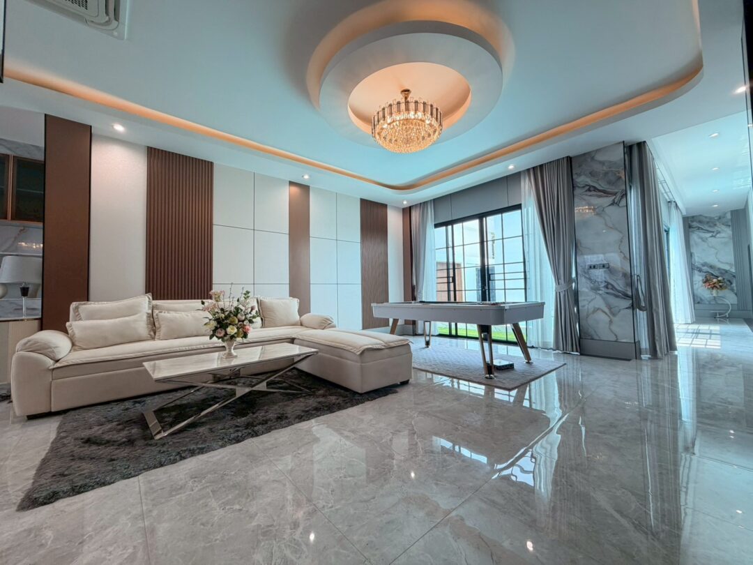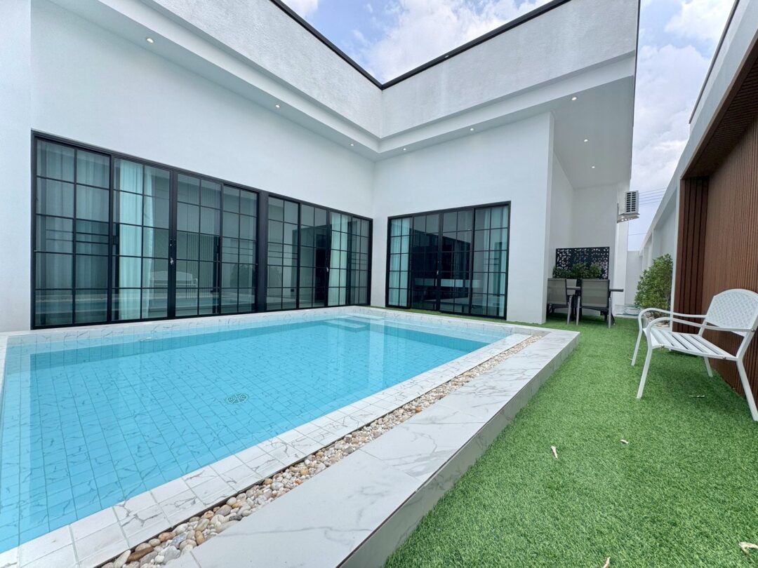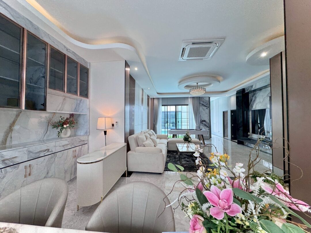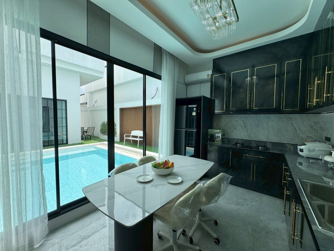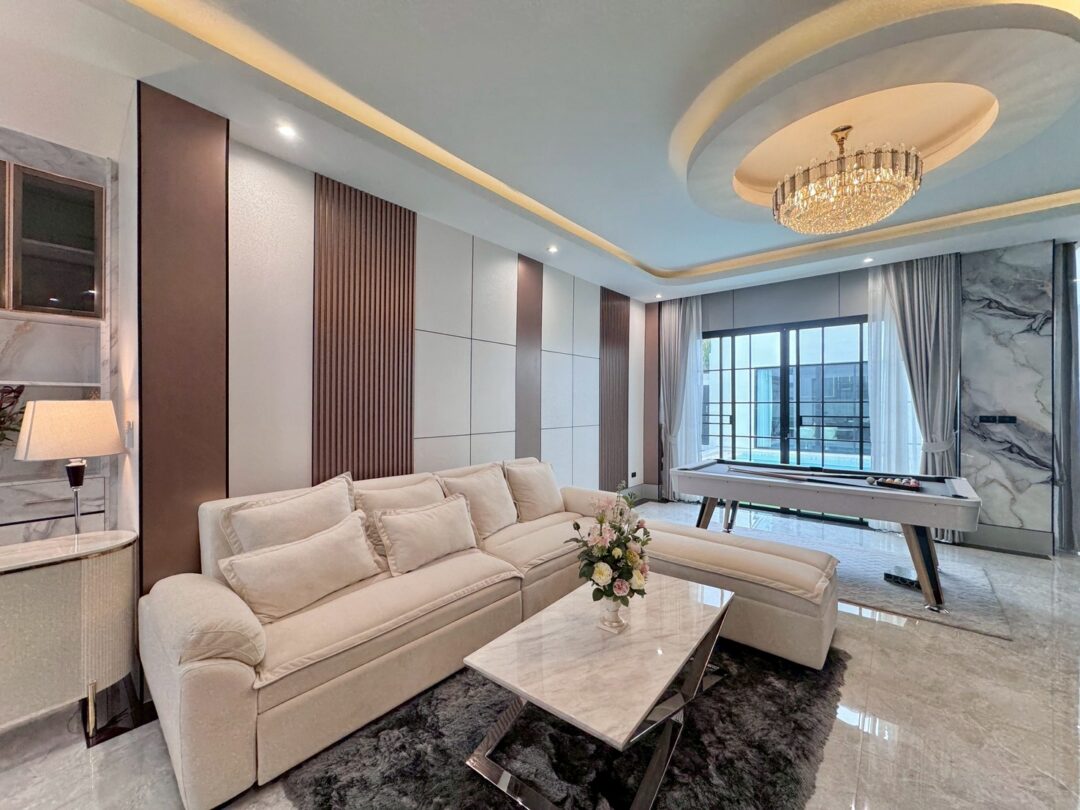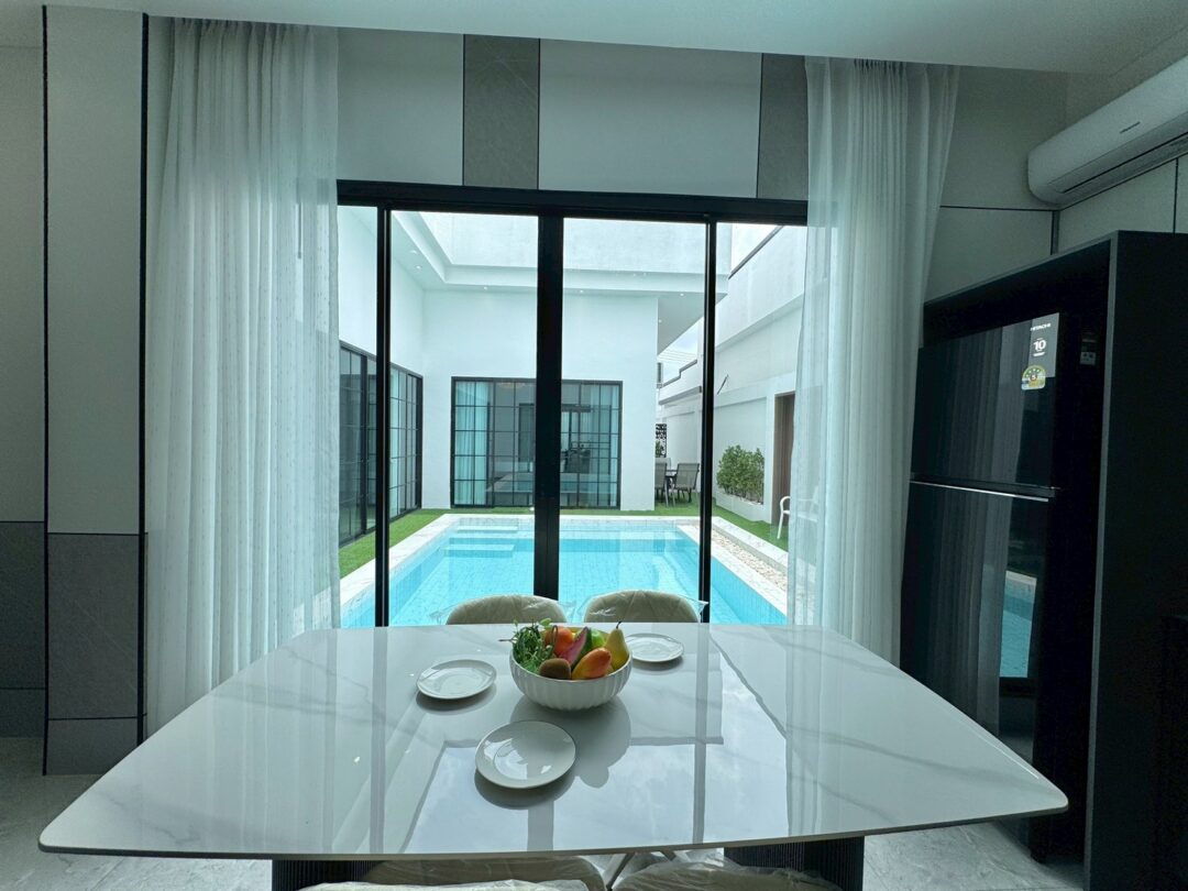 Luxury Modern Marble Pool Villa on 82 sq.wah (328 sqm) featuring 3 bedrooms, 4 bathrooms, spacious high-ceiling living room, and a fully equipped marble-style built-in kitchen. The highlight is a private swimming pool located in the center of the house, offering maximum privacy and comfort. Parking space available for 2 cars inside the property.