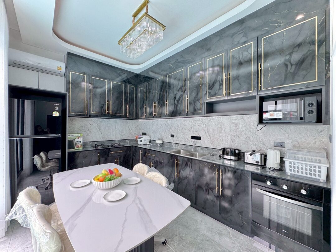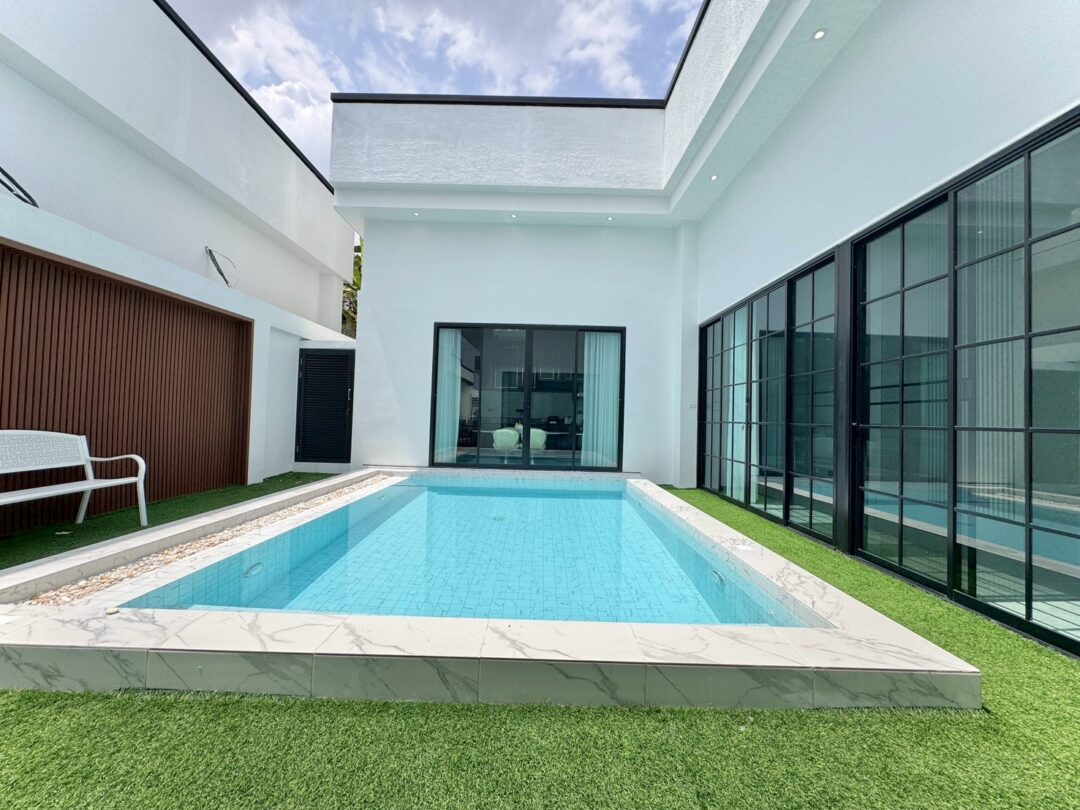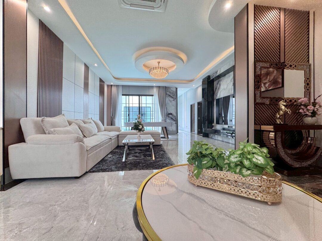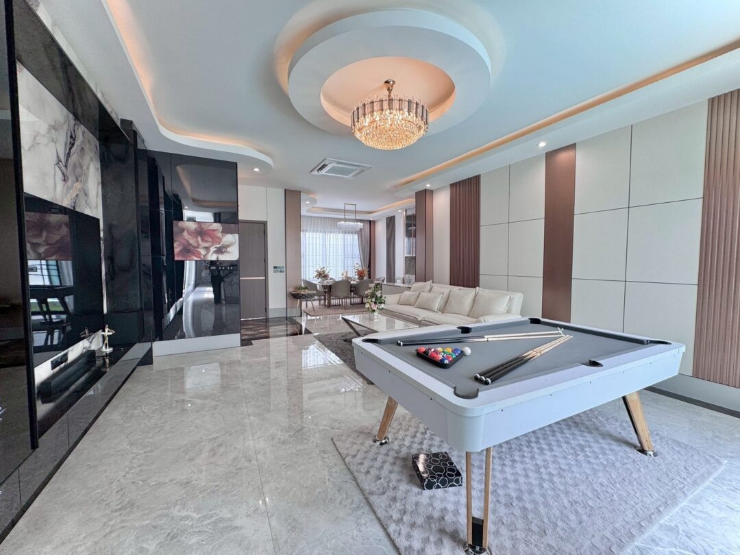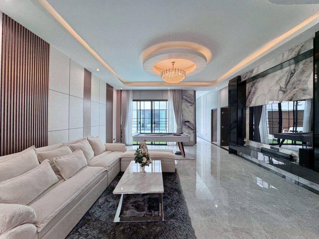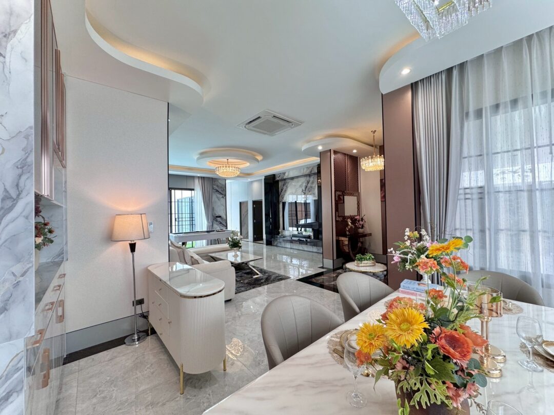 Luxury Modern Marble Pool Villa on 82 sq.wah (328 sqm) featuring 3 bedrooms, 4 bathrooms, spacious high-ceiling living room, and a fully equipped marble-style built-in kitchen. The highlight is a private swimming pool located in the center of the house, offering maximum privacy and comfort. Parking space available for 2 cars inside the property.