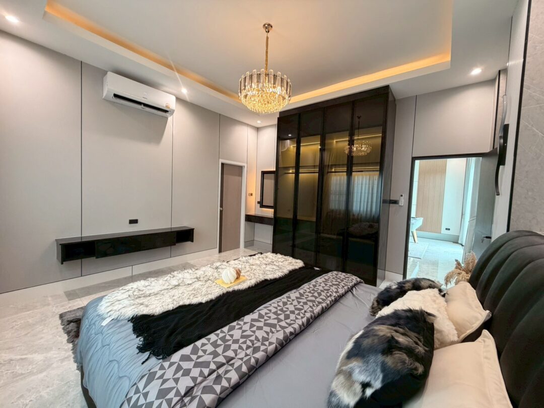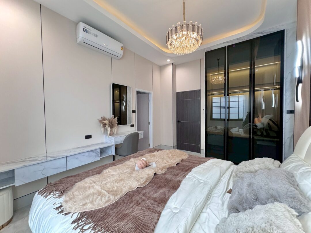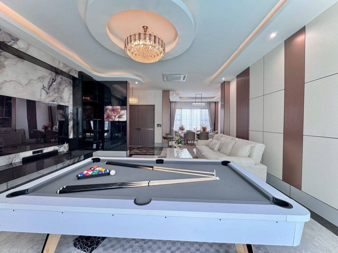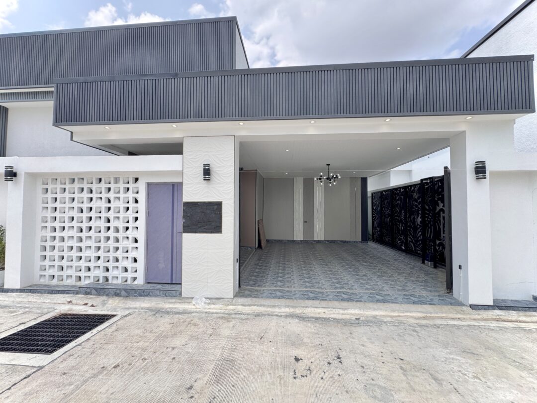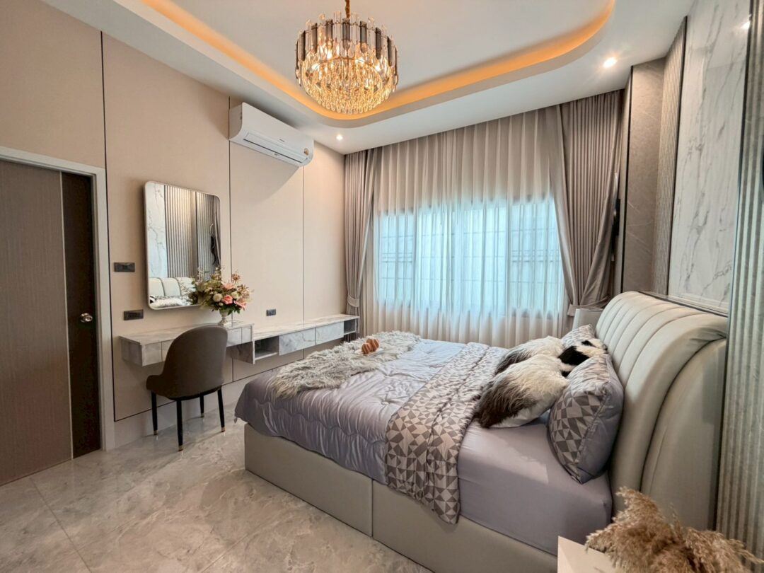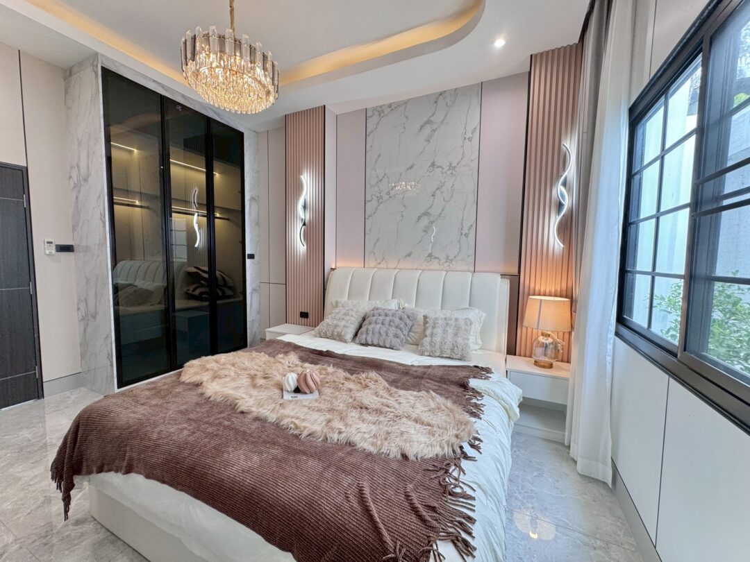Luxury Modern Marble Pool Villa on 82 sq.wah (328 sqm) featuring 3 bedrooms, 4 bathrooms, spacious high-ceiling living room, and a fully equipped marble-style built-in kitchen. The highlight is a private swimming pool located in the center of the house, offering maximum privacy and comfort. Parking space available for 2 cars inside the property.