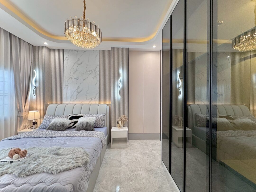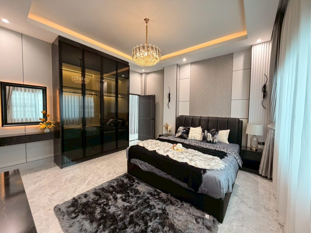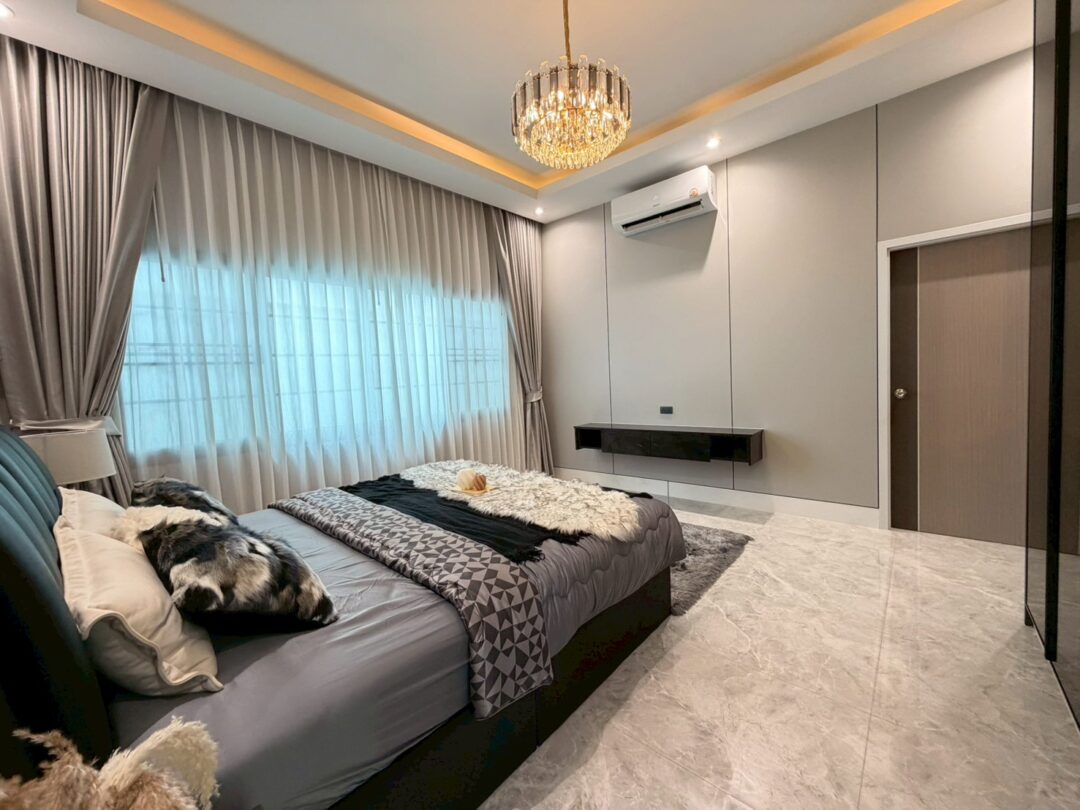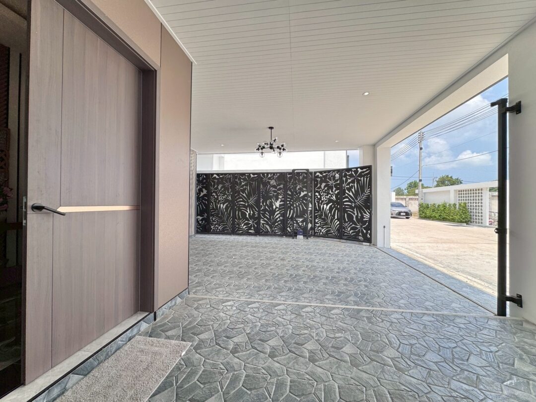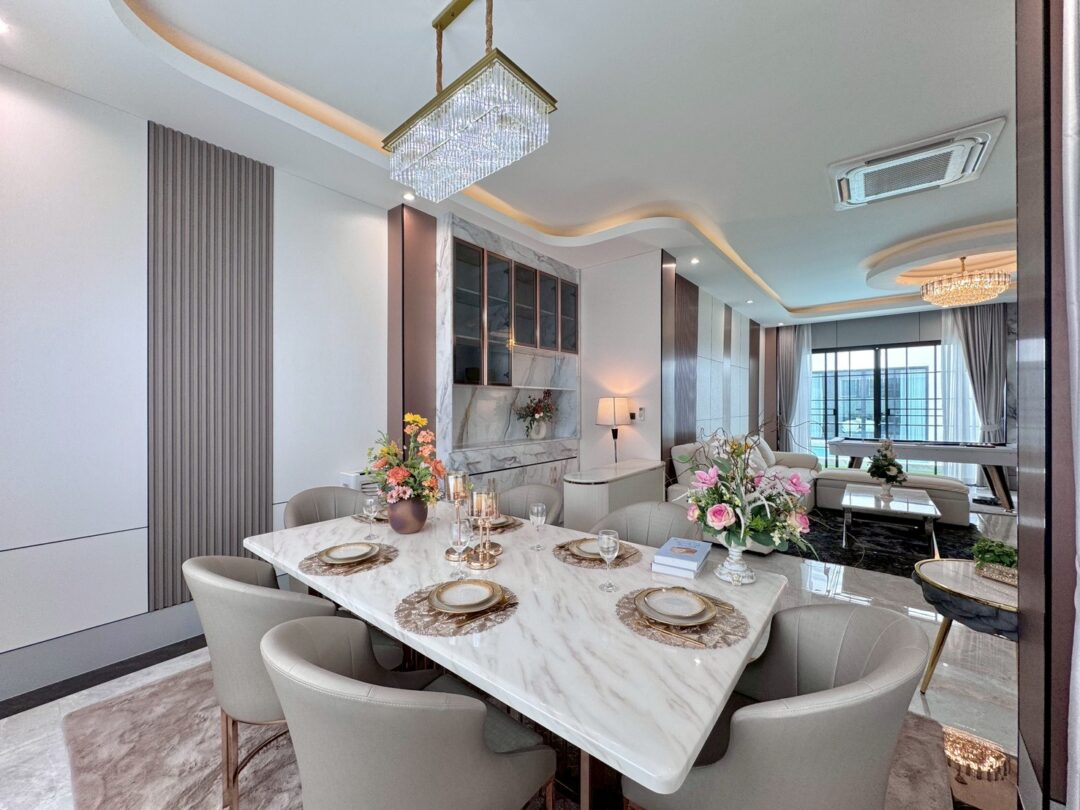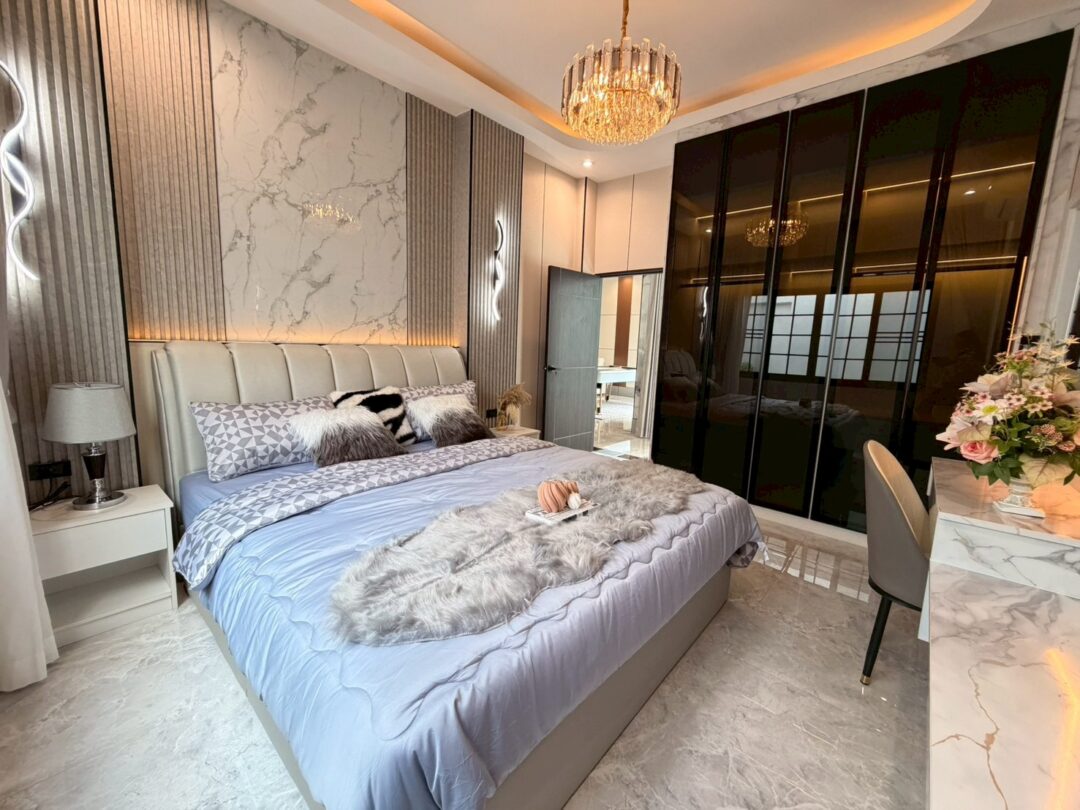 Luxury Modern Marble Pool Villa on 82 sq.wah (328 sqm) featuring 3 bedrooms, 4 bathrooms, spacious high-ceiling living room, and a fully equipped marble-style built-in kitchen. The highlight is a private swimming pool located in the center of the house, offering maximum privacy and comfort. Parking space available for 2 cars inside the property.