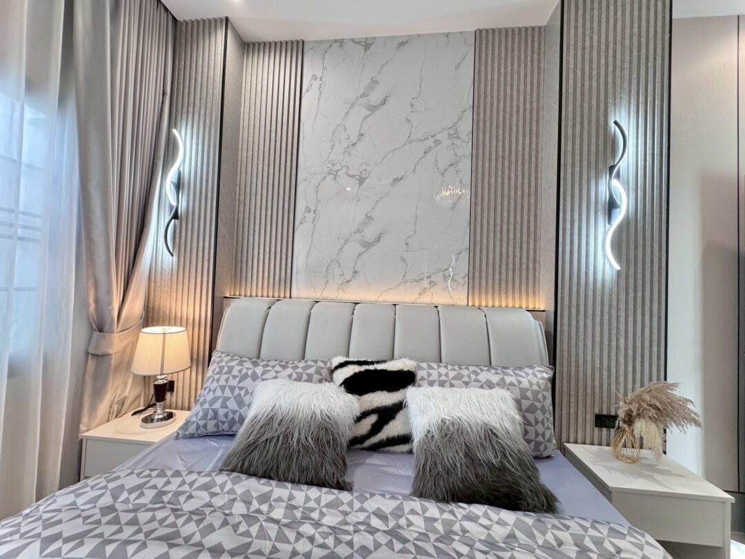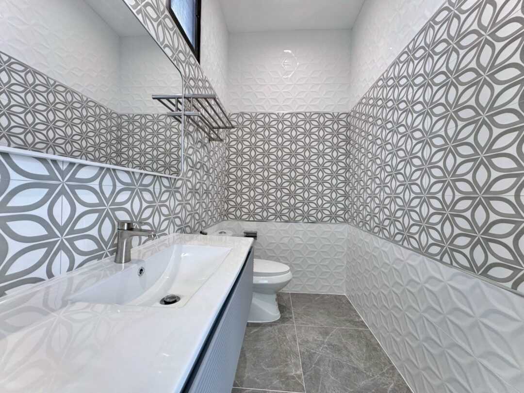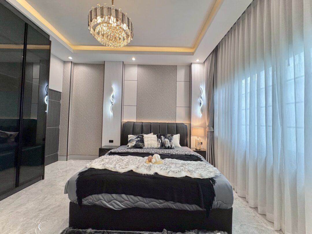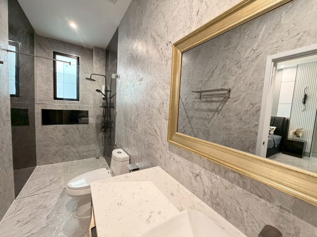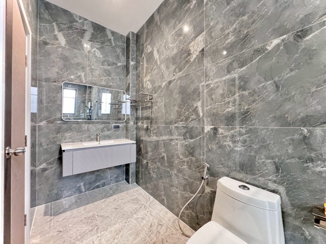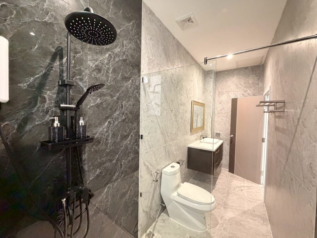 Luxury Modern Marble Pool Villa on 82 sq.wah (328 sqm) featuring 3 bedrooms, 4 bathrooms, spacious high-ceiling living room, and a fully equipped marble-style built-in kitchen. The highlight is a private swimming pool located in the center of the house, offering maximum privacy and comfort. Parking space available for 2 cars inside the property.